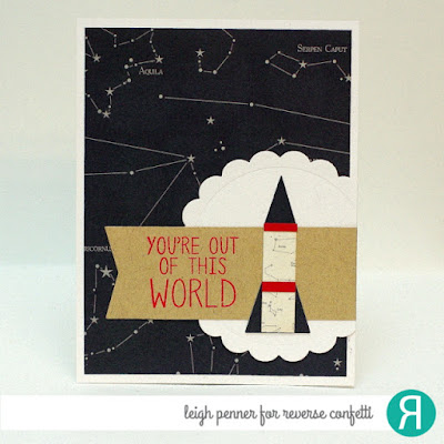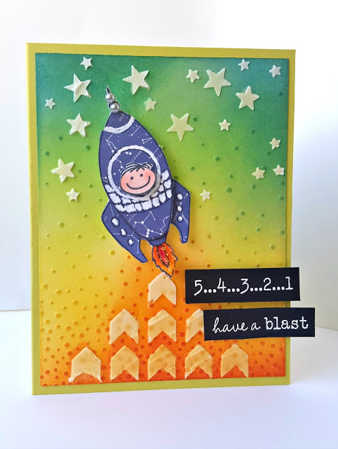 " Kelly has created a fun backdrop to her rocket. I love the combination of colors, and the embossing with the two different stencils on top is a fabulous look."