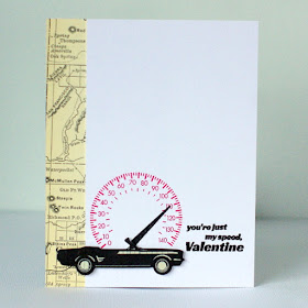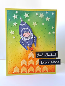 " Kelly has created a fun backdrop to her rocket. I love the combination of colors, and the embossing with the two different stencils on top is a fabulous look."