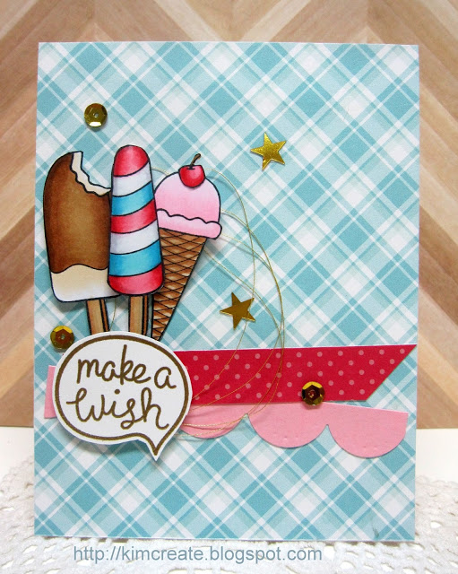 "the yummy looking ice cream treats on Kim's card look good enough to eat!!! They are coloured beautifully and I love the pretty blue plaid background!"